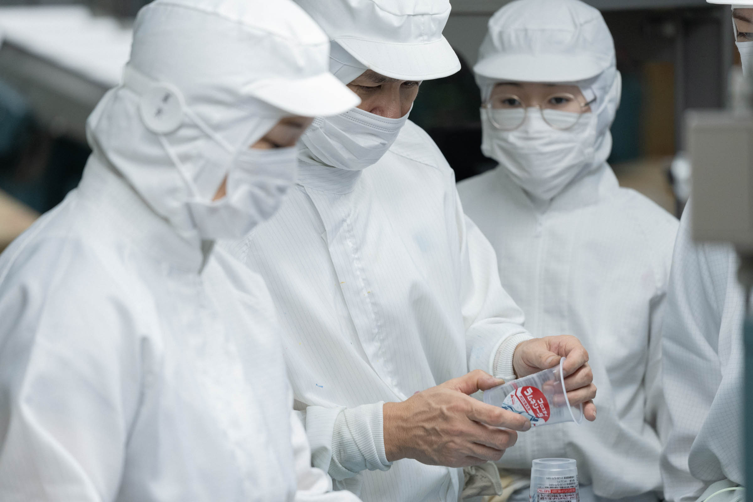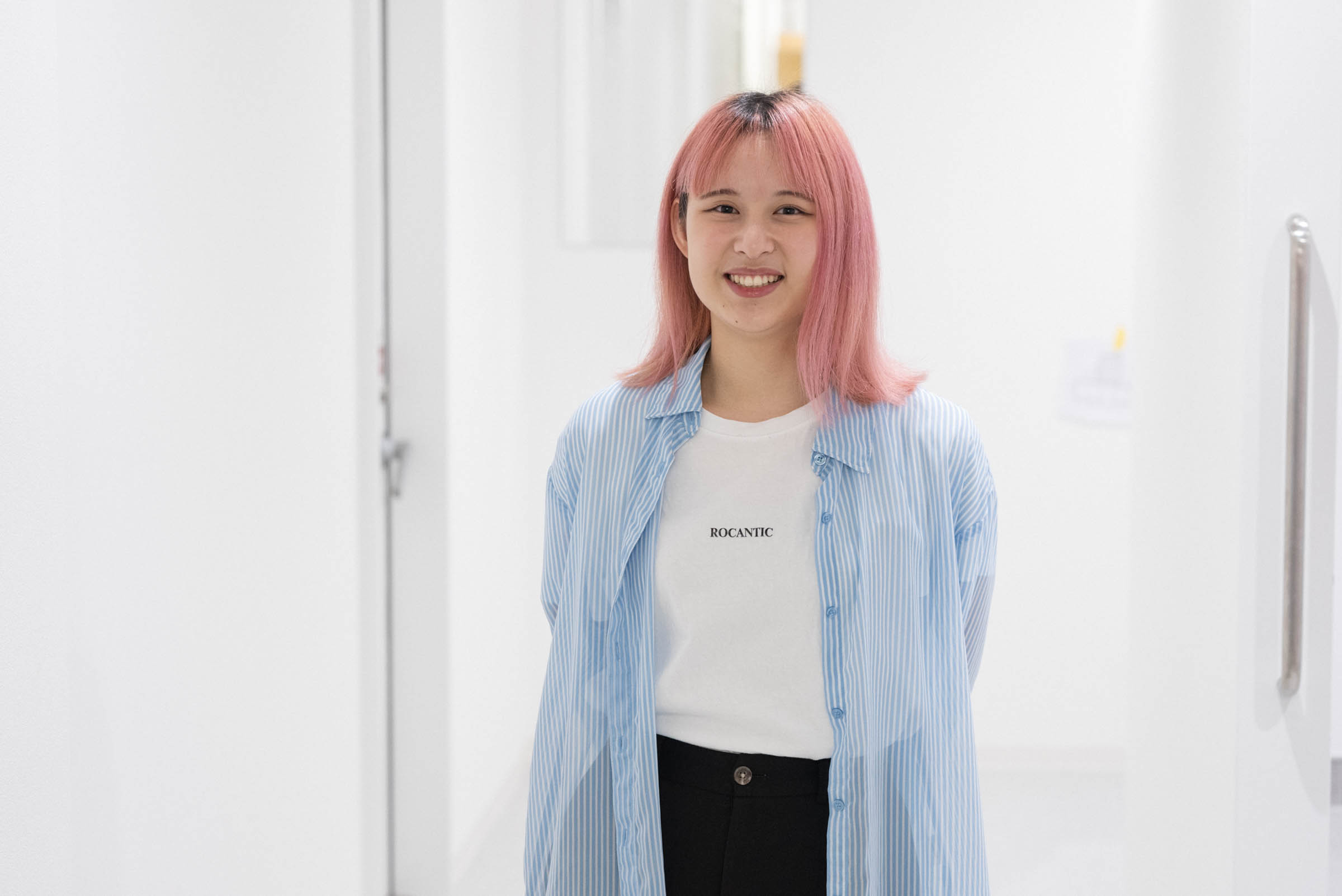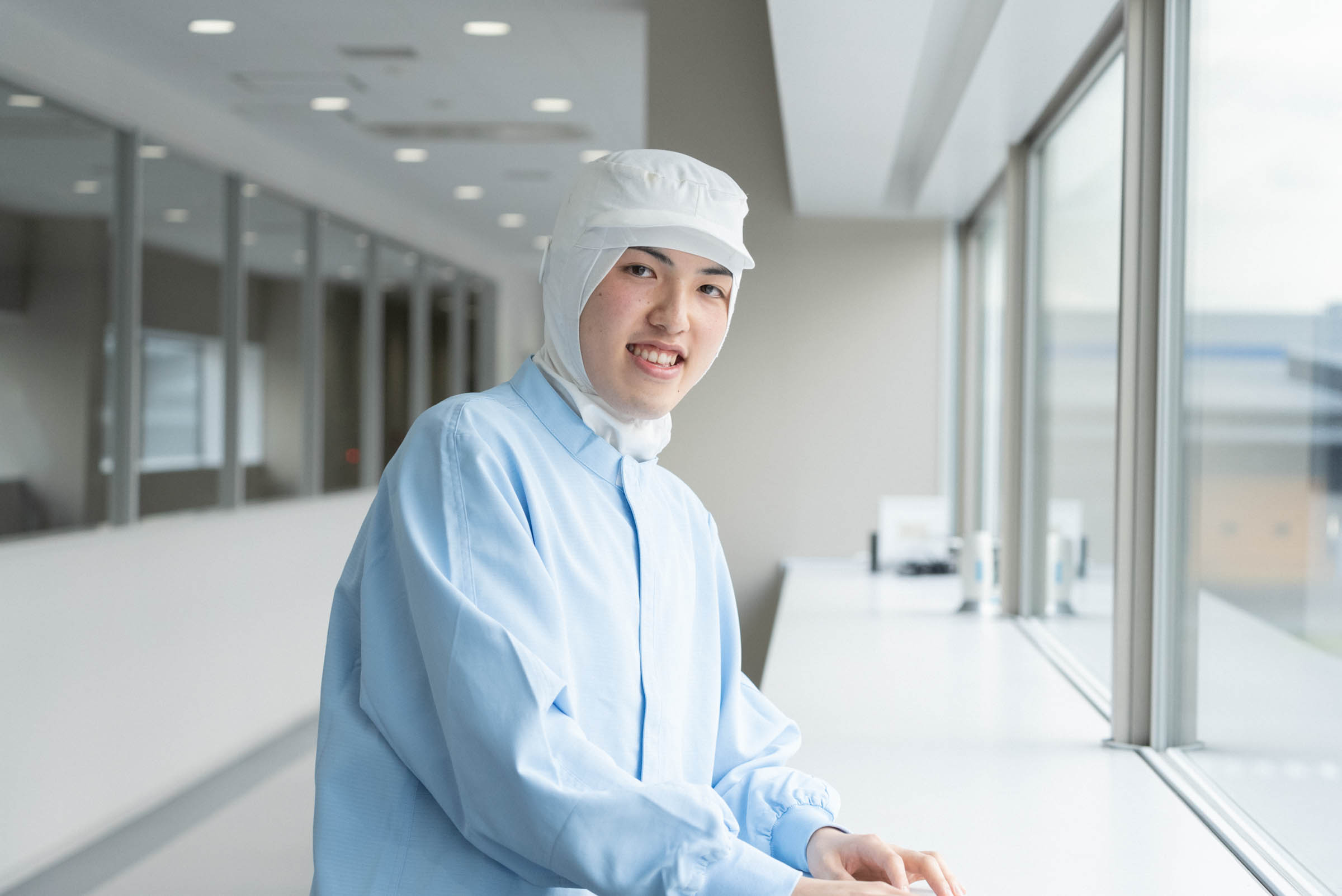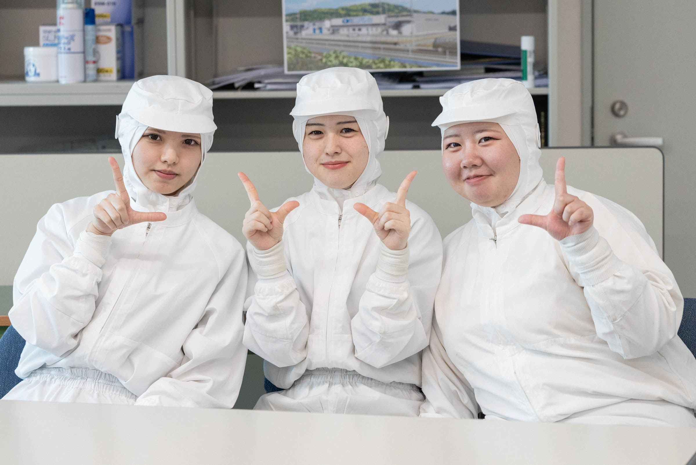 工場内で実際に働く社員をスナップで撮影。担当者の案内のもと、淡々と記録します。ただ制服とマスクを着用しているため、表情はよく見えません。休憩時間を使って、社員のポートレートを撮影。カメラ目線で捉えるポートレートは、見る人の関心を引きます。表情や瞳、髪型、ファッション。工場で働く素の先輩を見せることから始めました。