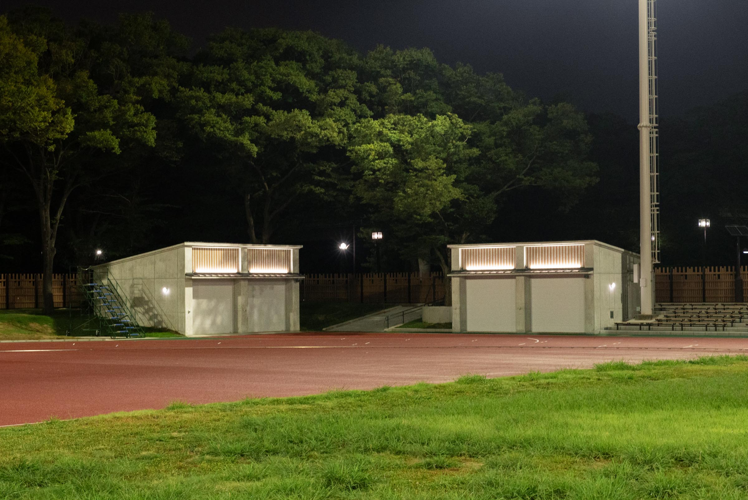 改修部分には共通した木材が多く使われています。フィールドハウス、倉庫、トイレ、客席、門、フェンス。いずれも公園の自然と調和しながら、現代的な建築デザインで作られています。その質感やライン、周囲との調和を意識して撮影しました。